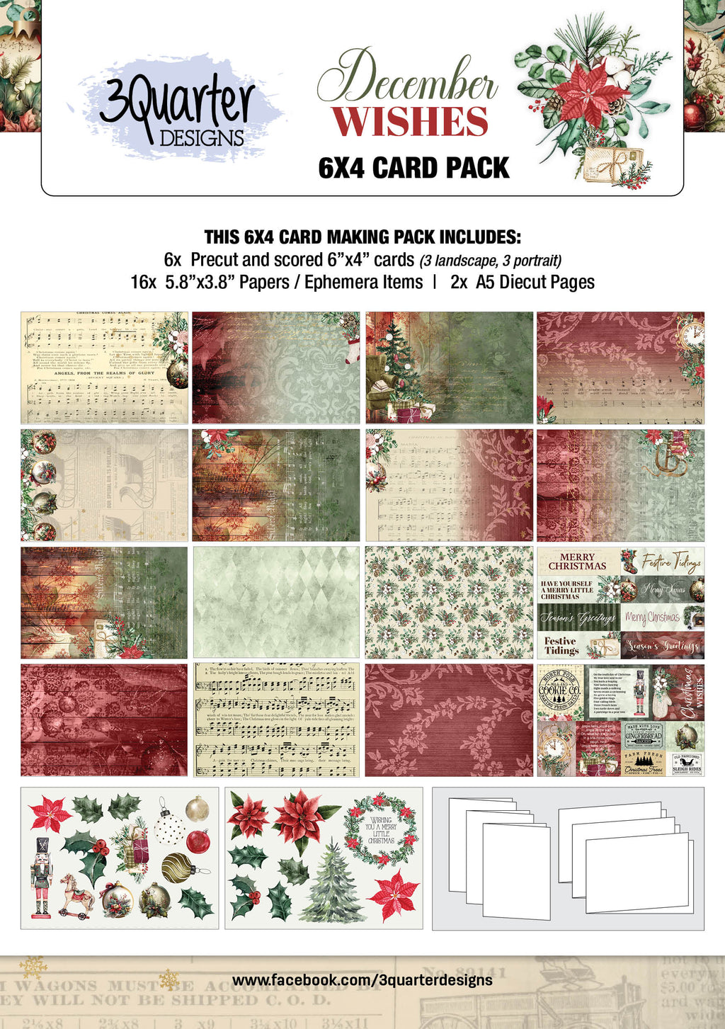The December Wishes 4" x 6" Card Pack with festive red and green tones has beautiful traditional Christmas themed designs paired with the designer's signature mixed texture look, creating the 3Quarter Designs unique and versatile much-loved look. Perfect for Christmas and Winter projects. The December Wishes collection includes a 12" x 12" Scrapbook Collection Pack, an 8" x 8" Paper Pack, a 6" x 6" Paper Pack and a 4" x 6" Card Pack. All sold separately. Designed and printed in New Zealand.