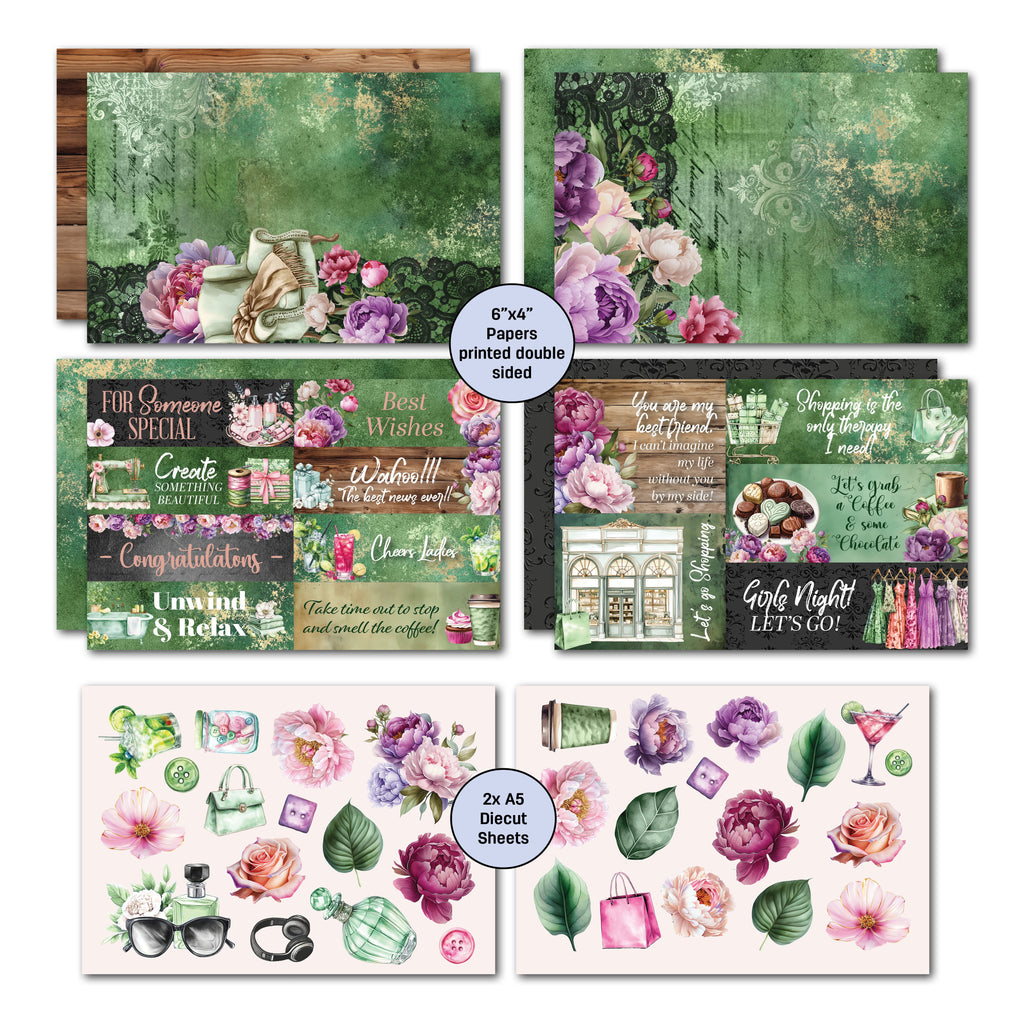 The Girls Weekend collection is a mixture of wood, and lace, and flowers, with some shopping, a spa, eating and coffee all tied together with fresh green, brown and pink tones. This collection is ideal for crafting unique projects inspired by women’s special moments. Celebrate the important women in your life with style and sophistication.