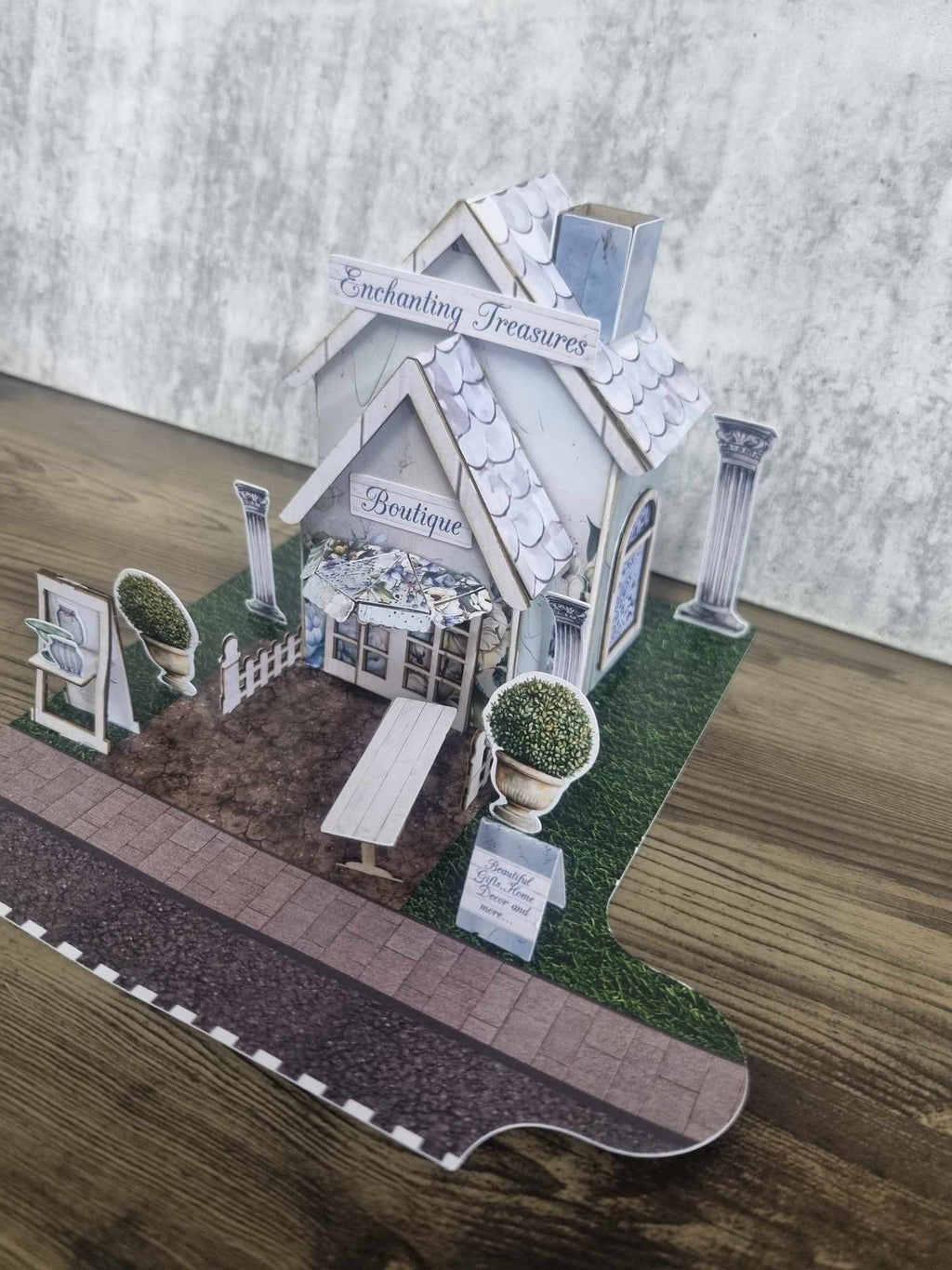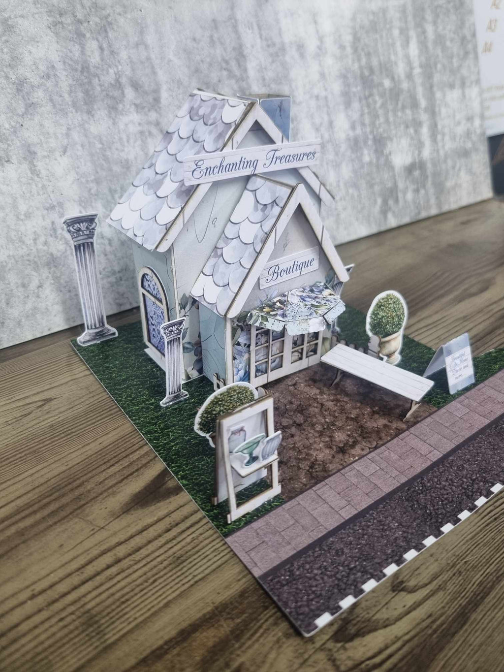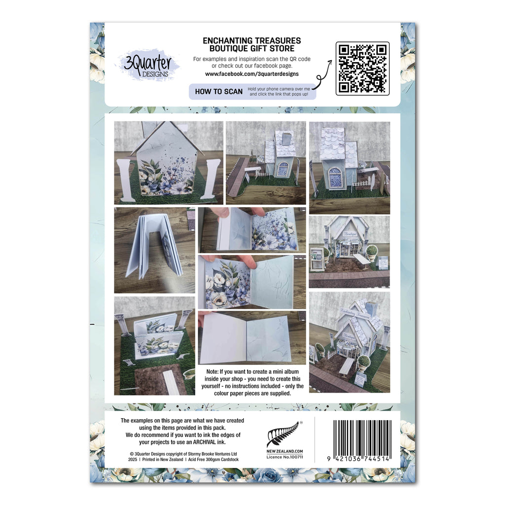 Part 7 of the Lane Village collection, the Enchanting Treasures Boutique Gift Shop set is an elegant store with a delicate verandah cover and a charming little front stand. The set comes with spare papers to make a mini album inside if you wish! Or create something else with the extra papers. The covers have photos to show you what to do but no instructions are included. A video will be available on the 3Quarter Facebook page as well as the album for the 3Quarter Lane village examples.