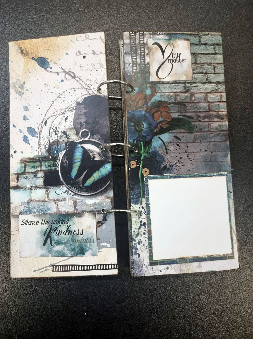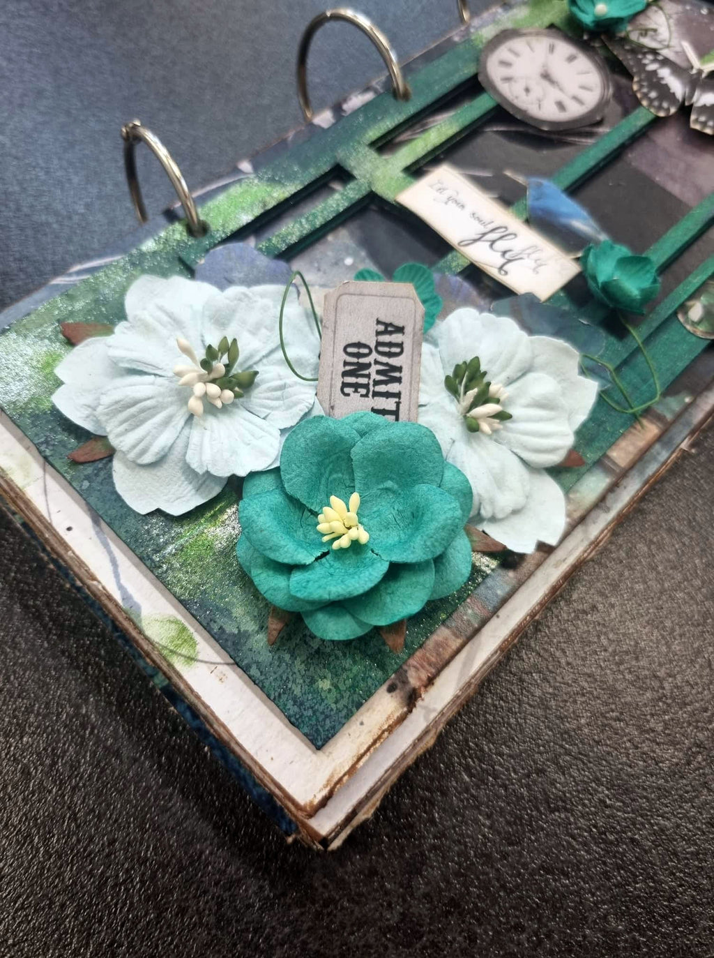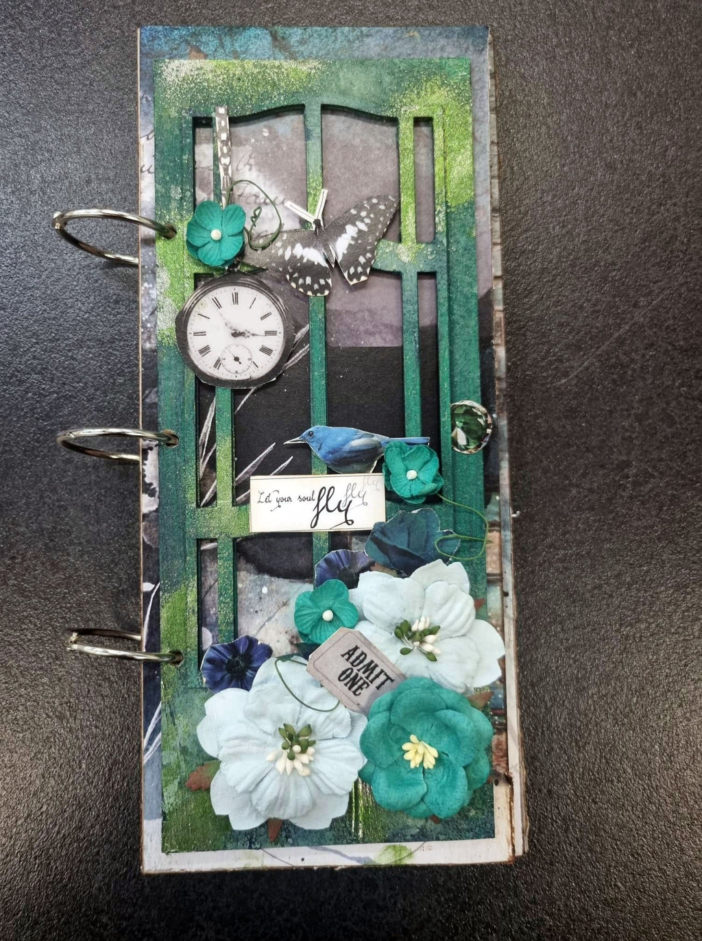 The 3Quarter Designs Mini Album Base Kit Urban Turquoise has a vintage feel with images of brick walls, windows, a front door, pocket watches, birds, butterflies, flowers and more.