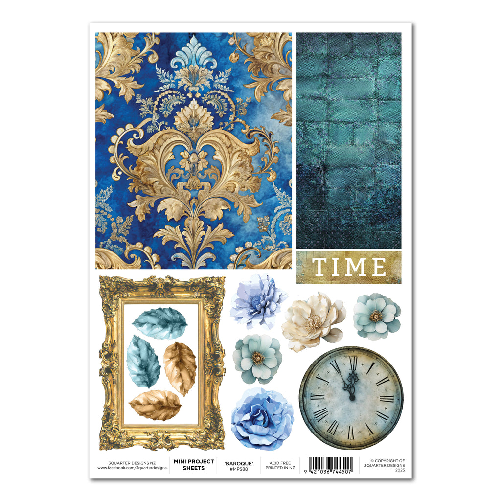 This stunning mini project sheet has a Baroque theme in classic blue, brown and cream shades. The designs make this sheet perfect for a variety of uses, providing endless creative possibilities. This versatile A4 sheet is perfect to create an easy mini project like a card, tag or even a scrapbook page with everything you need for layering on one sheet! Designed and printed in New Zealand.