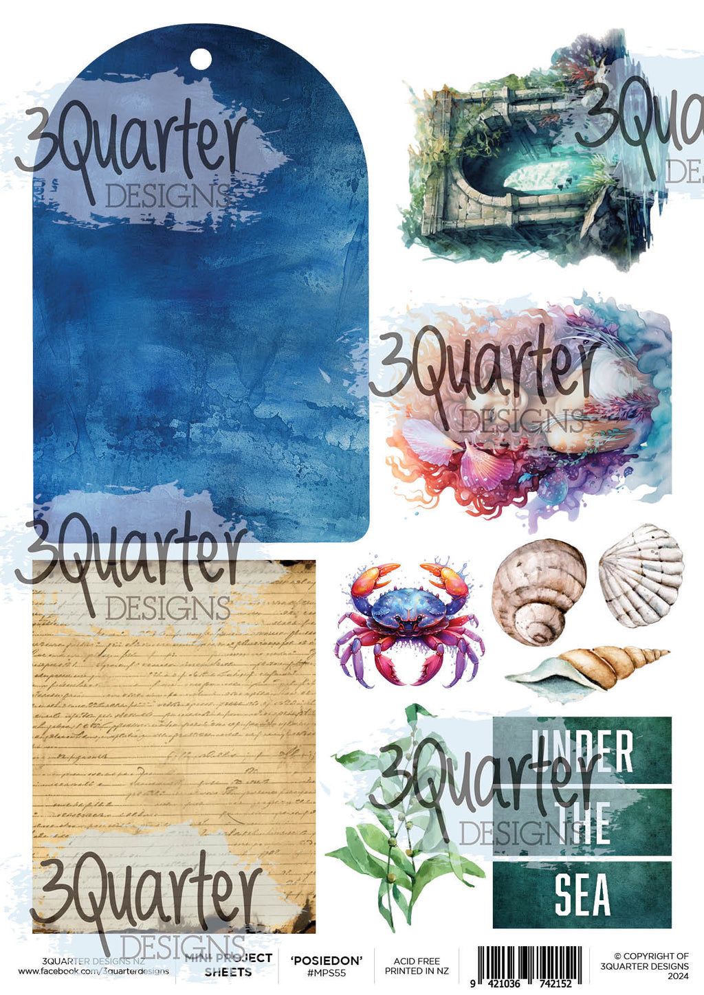 This Poseidon Mini Project Sheet with blue tones featuring magical underwater themed designs features "Poseidon's Kingdom" elements including shells, a crab and seagrass. This versatile A4 sheet is perfect to create a easy mini project with everything you need for layering on one sheet!