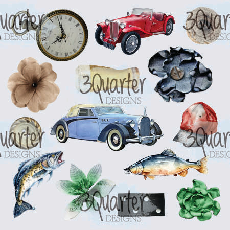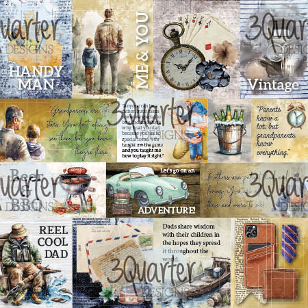 12 single sided 6" X 6" papers with male-themed vintage feel designs with a page featuring "Dadz Life" elements and ephemera to be fussy cut with vintage cars, a vintage watch, a ball cap, a glass of beer, florals and more