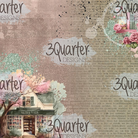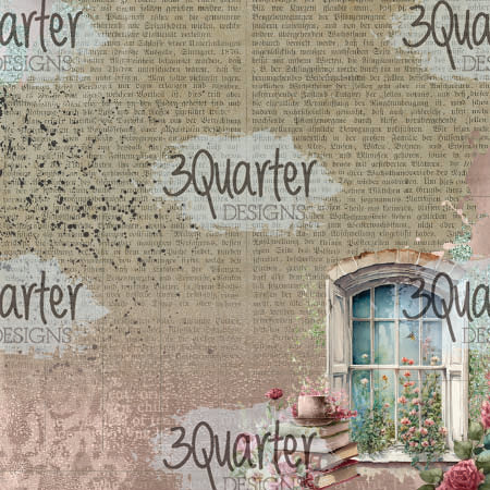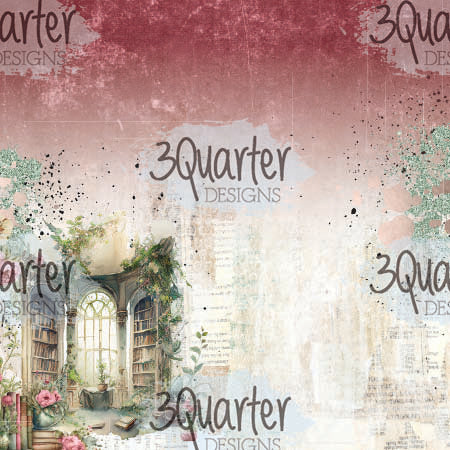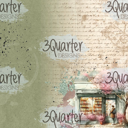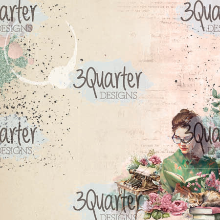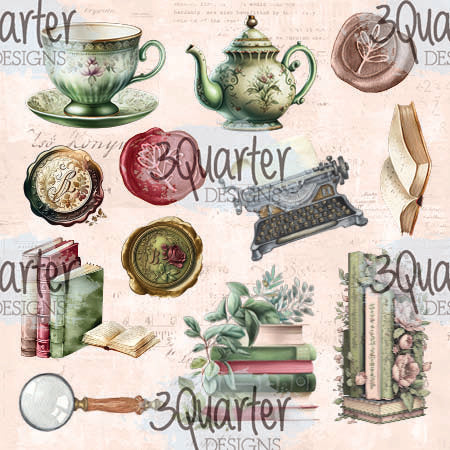 12 single sided 6" X 6" papers with book themed vintage feel designs with a page featuring "The Storyteller" elements and ephemera to be fussy cut with images of books, a vintage typewriter, a teacup and teapot, a magnifying glass, florals and more