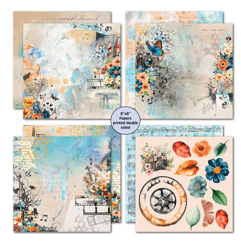 3Quarter Designs' take on music and theatre with pops of orange, on a base of blues and cream; featuring filmstrips, musical scores, and cameras making this collection a very versatile pack.
