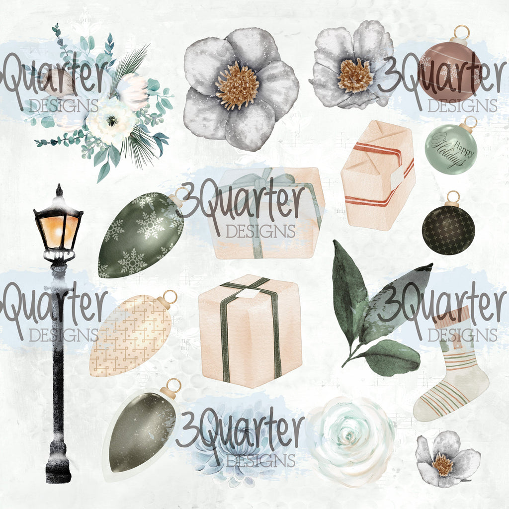 • 12 single sided 8" X 8" papers with white, cream and green tones has beautiful Christmas and Winter themed designs with one page featuring "Fairytale Christmas" elements and ephemera to be fussy cut with images of a lamp post, florals, ornaments, gifts and more