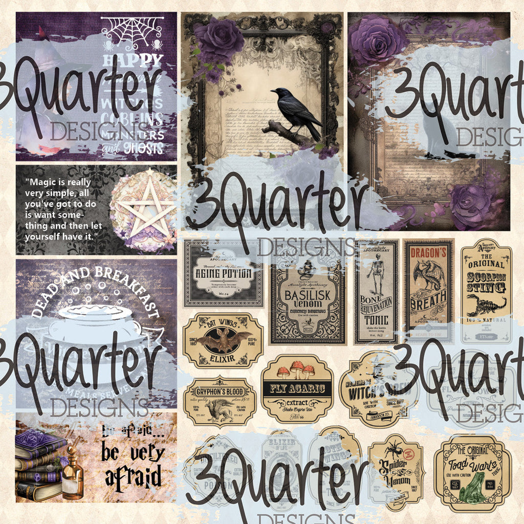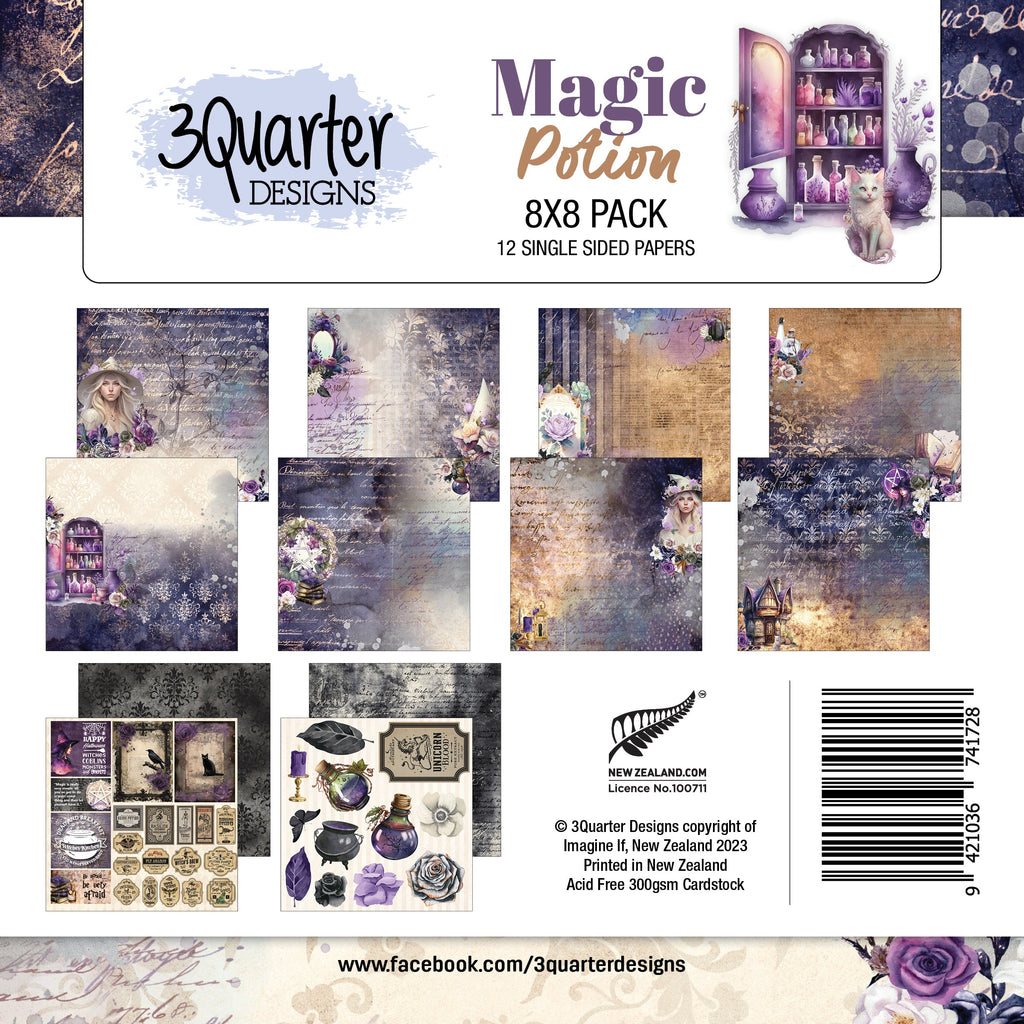 • 12 single sided 8" X 8" papers with beautiful amethyst and black tones has stunning Halloween themed designs with a page featuring "Magic Potion" elements and ephemera to be fussy cut with images of a cauldron, potion bottles, a candle, a moth, florals and more