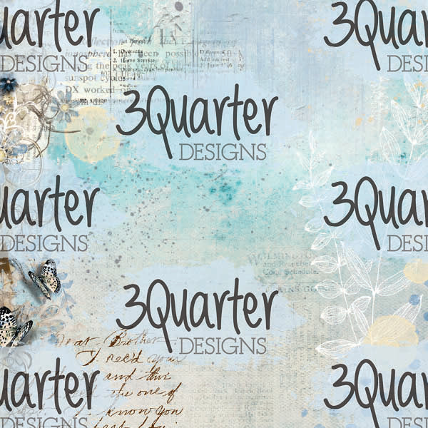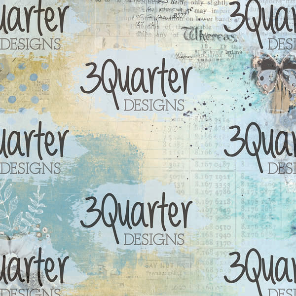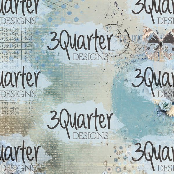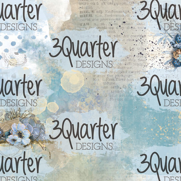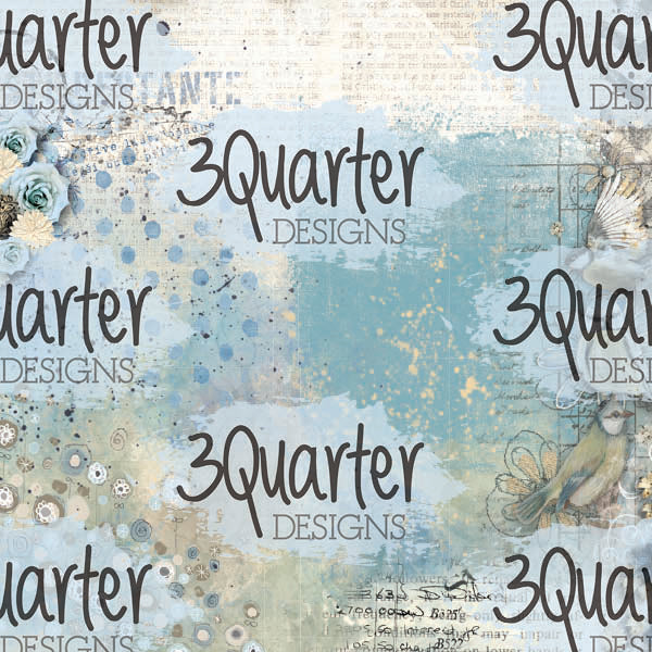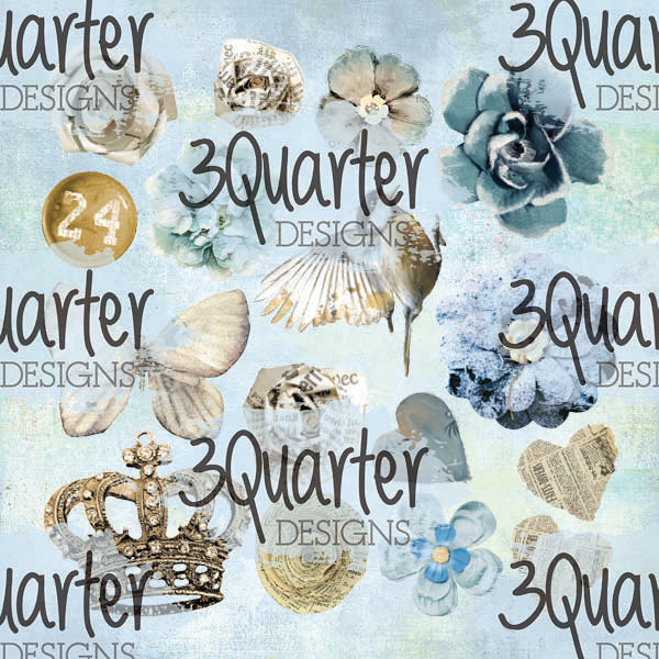 12 single sided 8" X 8" papers with blue tones and a weathered feel and includes a page featuring "Melancholy Era" elements and ephemera to be fussy cut with images of birds, butterflies, hearts, a crown, florals and more