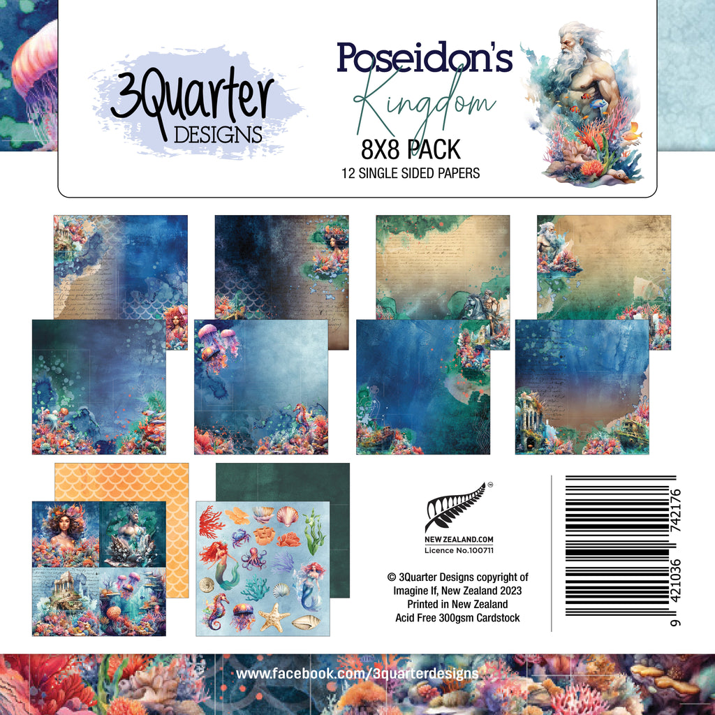 12 single sided 8" X 8" papers with vibrant blue and green tones featuring magical underwater themed designs with Poseidon and beautiful mermaids and includes a page featuring "Poseidon's Kingdom" elements and ephemera to be fussy cut with images of mermaids, coral, shells, a crab, a starfish, seagrass and more