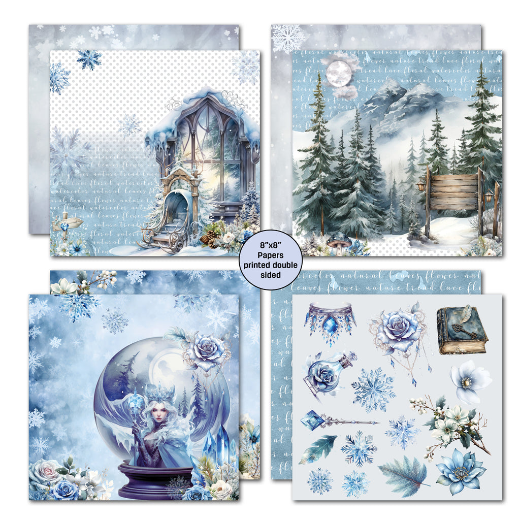 Immerse yourself in a captivating winter realm with this expertly curated Winter Chronicles collection. Soft and subtle, the serene blues and whites lead you to enchanted landscapes with frost-kissed forests, a majestic ice castle and where regal snow queens reign. This collection boasts delicate snowflakes and stunning floral motifs plus lots of beautiful embellishments to add dimension to your craft. Perfect for crafters seeking to capture the magic and elegance of winter.