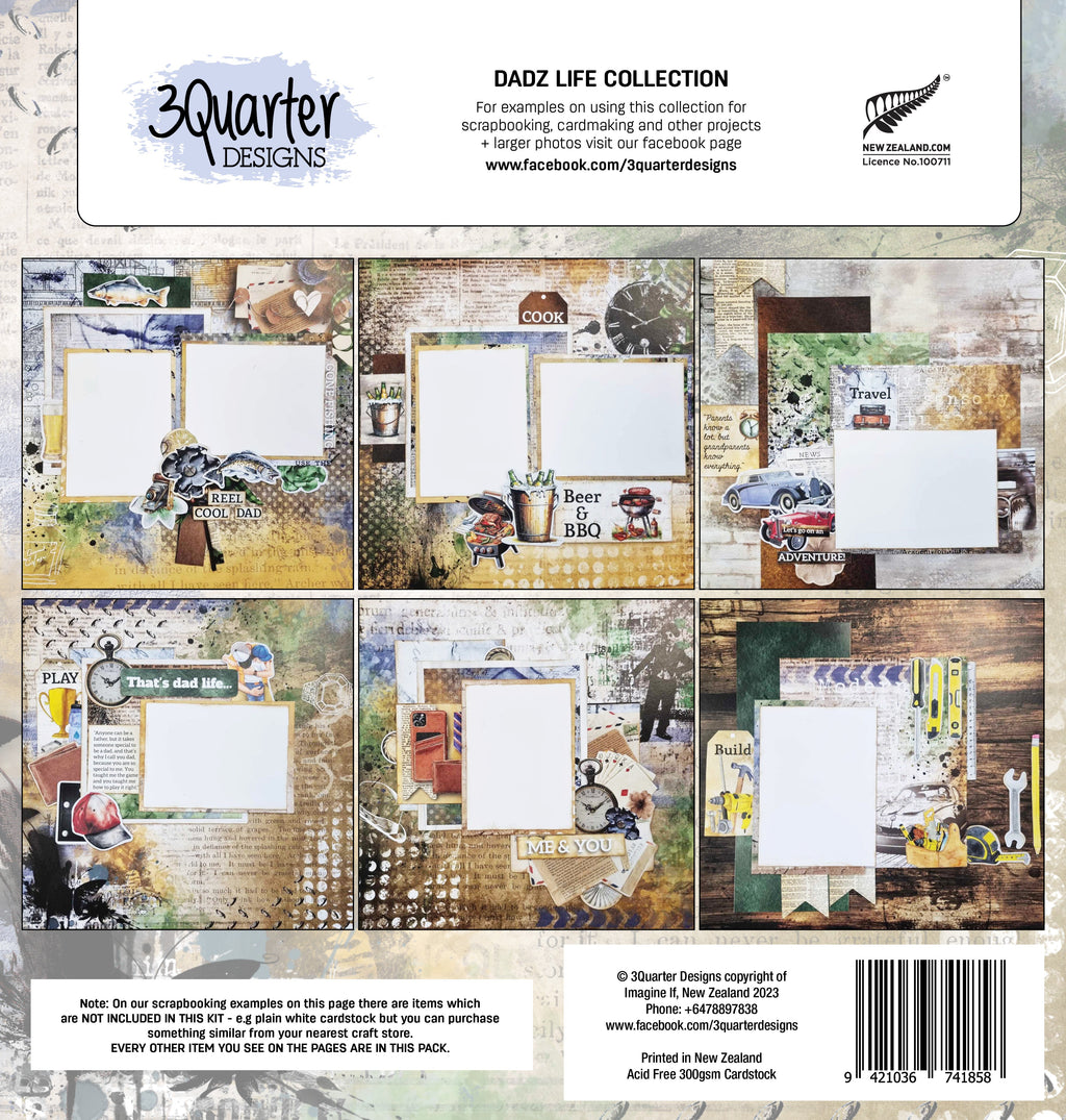 The Dadz Life 12" X 12" Scrapbook Collection Pack features male-themed vintage feel designs paired with the designer's signature mixed texture look, creating the 3Quarter Designs unique and versatile much-loved look. Perfect for projects for any occasion. The Dadz Life collection includes a 12" x 12" Scrapbook Collection Pack, an 8" x 8" Paper Pack, a 6" x 6" Paper Pack and a 4" x 6" Card Pack. All sold separately. Designed and printed in New Zealand.