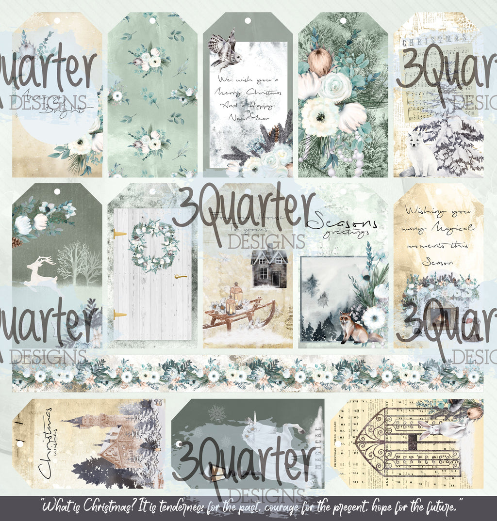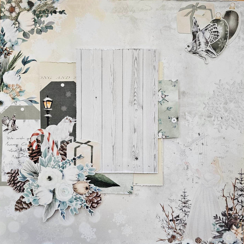 - 12 single sided 12" x 12" papers with white, cream and green tones featuring beautiful Christmas and Winter themed designs