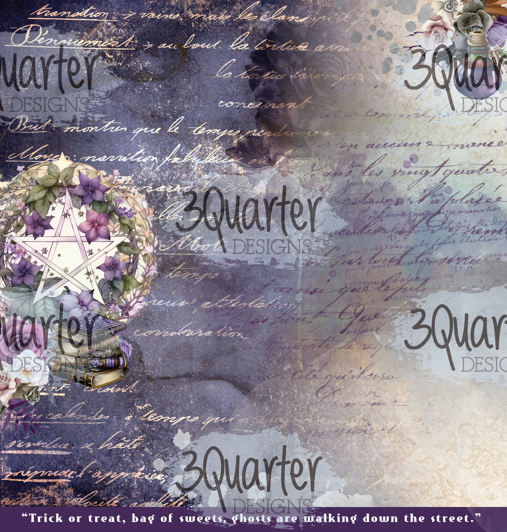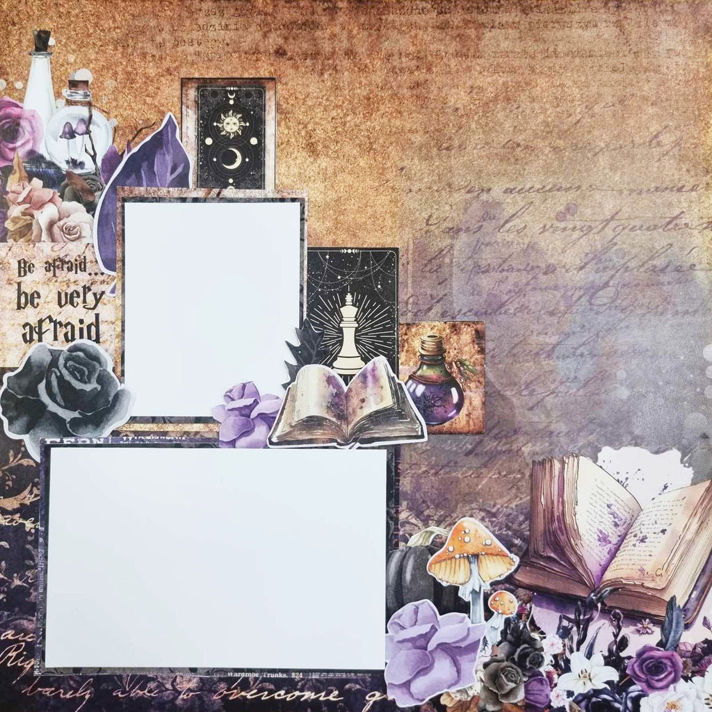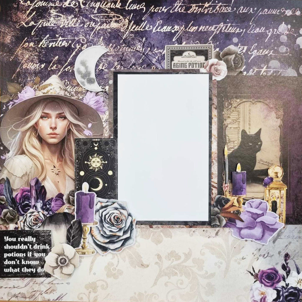 - 6 fussy cutting pages featuring matts, quotes, foldable pockets, labels, and other paper elements to be used amongst your designs with images of potion bottles, a full moon, candles, books, pumpkins, florals and more