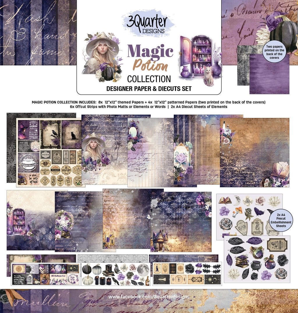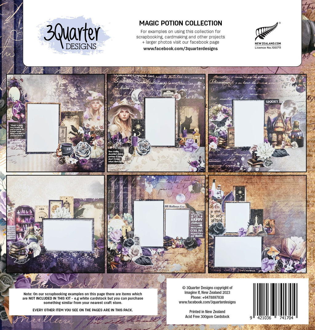 The Magic Potion 12" X 12" Scrapbook Collection Pack with beautiful amethyst and black tones has stunning Halloween themed designs paired with the designer's signature mixed texture look, creating the 3Quarter Designs unique and versatile much-loved look. Perfect for Halloween projects. The Magic Potion collection includes a 12" x 12" Scrapbook Collection Pack, an 8" x 8" Paper Pack, a 6" x 6" Paper Pack and a 4" x 6" Card Pack. All sold separately. Designed and printed in New Zealand.