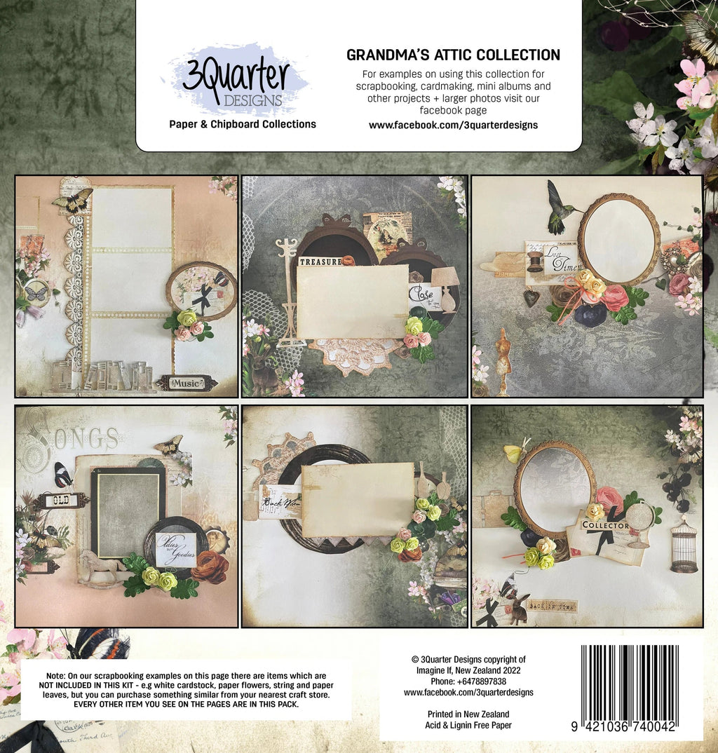 The 3Quarter Designs Grandma's Attic Collections make 6 Layouts and has a vintage feel with florals and lace plus images of items found in your Grandma's attic. The back cover features 6 layouts designed using this collection as inspiration for what you can make!