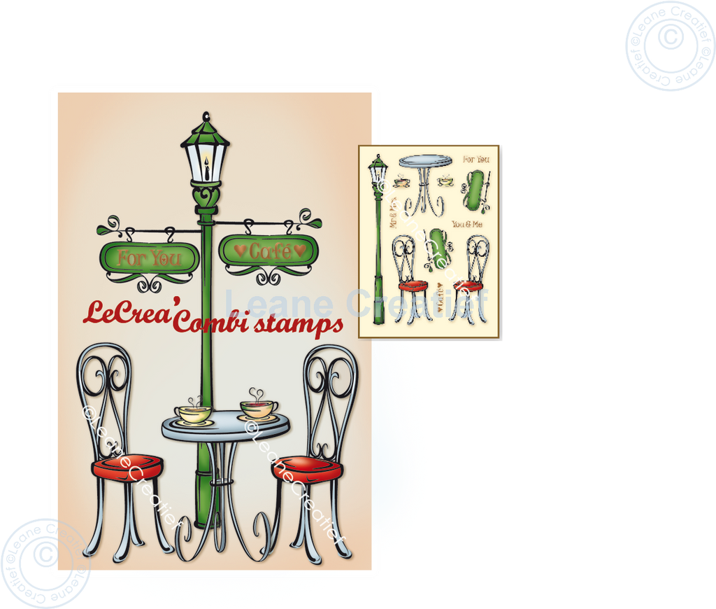 Create your perfect café scene with this On A Terrace stamp set. These clear stamps include a bistro table, 2 chairs, 2 coffee cups, 2 street signs, a lamp post and text 'Mr & Mrs', 'For You', 'You & Me', and 'Café' . Can be combined with the many other combi stamps.