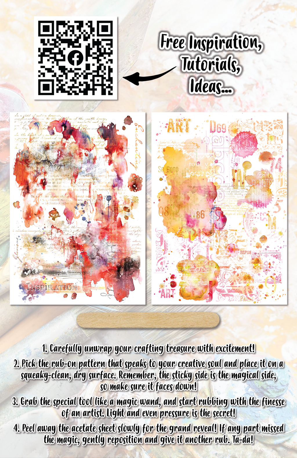 Rub-on pack includes 2x A5 sheets and a user-friendly applicator for effortless results on diverse surfaces such as paper, furniture, wood, glass, porcelain, and more... The perfect add for all kinds of craft projects.