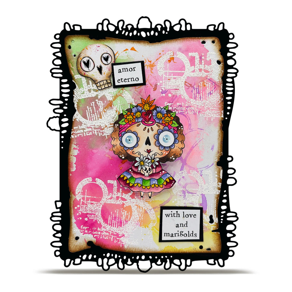 Great mix of stamps with a wonderful array of Day of the Dead elements. This stamp set features a girl dressed in her Day of the Dead outfit, the set also includes a painted skull, a mirror, a flower and the perfect text for finishing off your projects. This high-quality set of UK-made deeply-etched photopolymer clear stamps is perfect for achieving sharp, detailed impressions. Designed to adhere effortlessly to any clear acrylic block, these stamps provide excellent precision for your crafting projects. The sheet measures 7.3x10.25 cm and includes 6 versatile stamps, ideal for adding a personal touch to your creations.