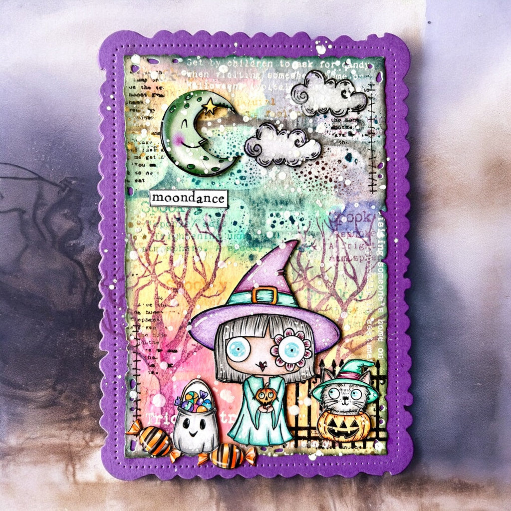 Great mix of stamps with a wonderful array of fun Halloween elements. This stamp set features a girl dressed as a witch, the set also includes a cat popping out of a Jack-O-Lantern, a smiling moon, a gate, a cloud element and the perfect text for finishing off your Halloween projects. This high-quality set of UK-made deeply-etched photopolymer clear stamps is perfect for achieving sharp, detailed impressions. Designed to adhere effortlessly to any clear acrylic block, these stamps provide excellent precision for your crafting projects. The sheet measures 7.3x10.25 cm and includes 8 versatile stamps, ideal for adding a personal touch to your creations.