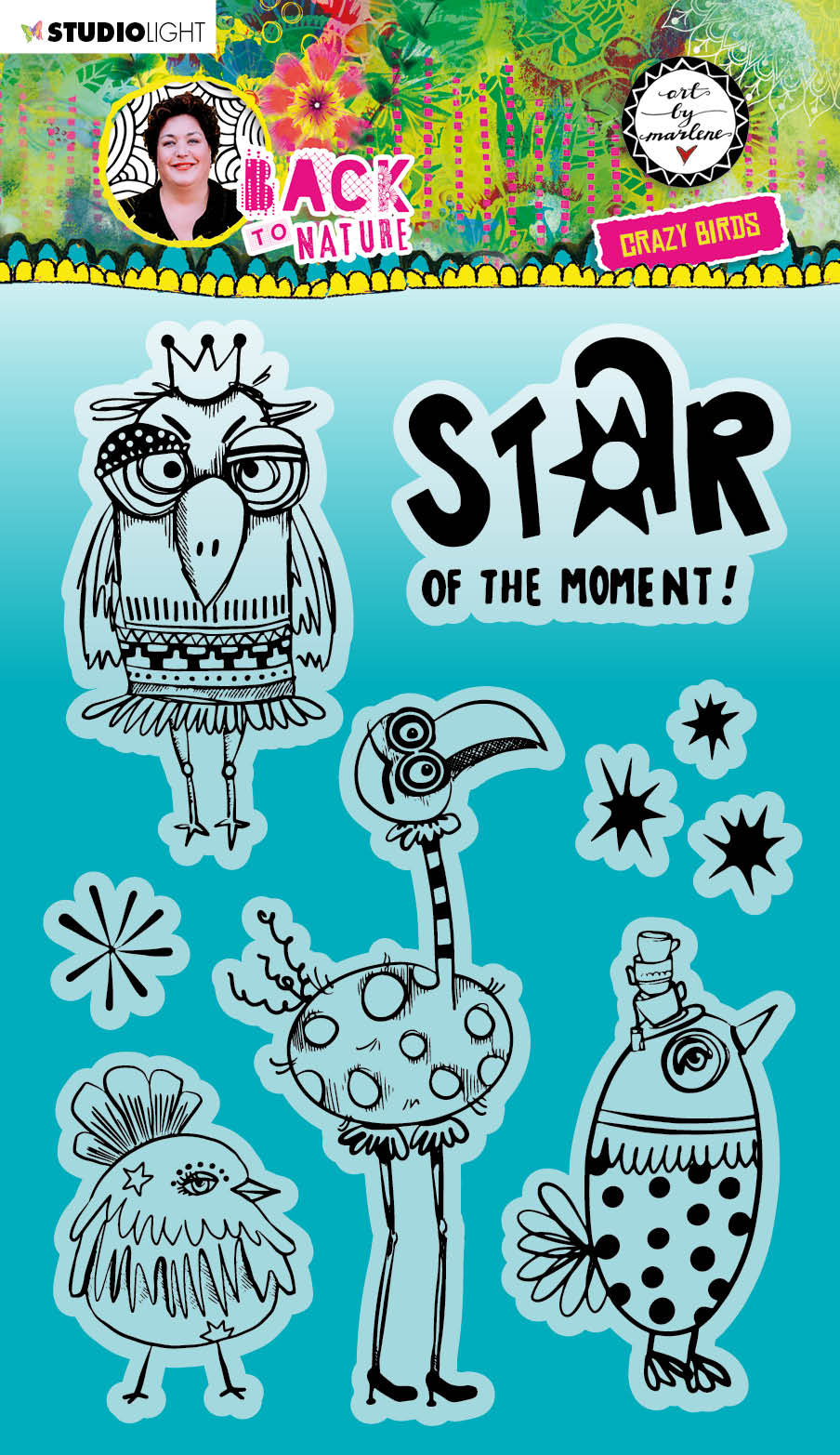 This Crazy Birds clear stamp set has a variety of fun birds, text 'Star of the moment' and extra elements to finish your project. They can be used for scrapbooking, journaling and card making.
