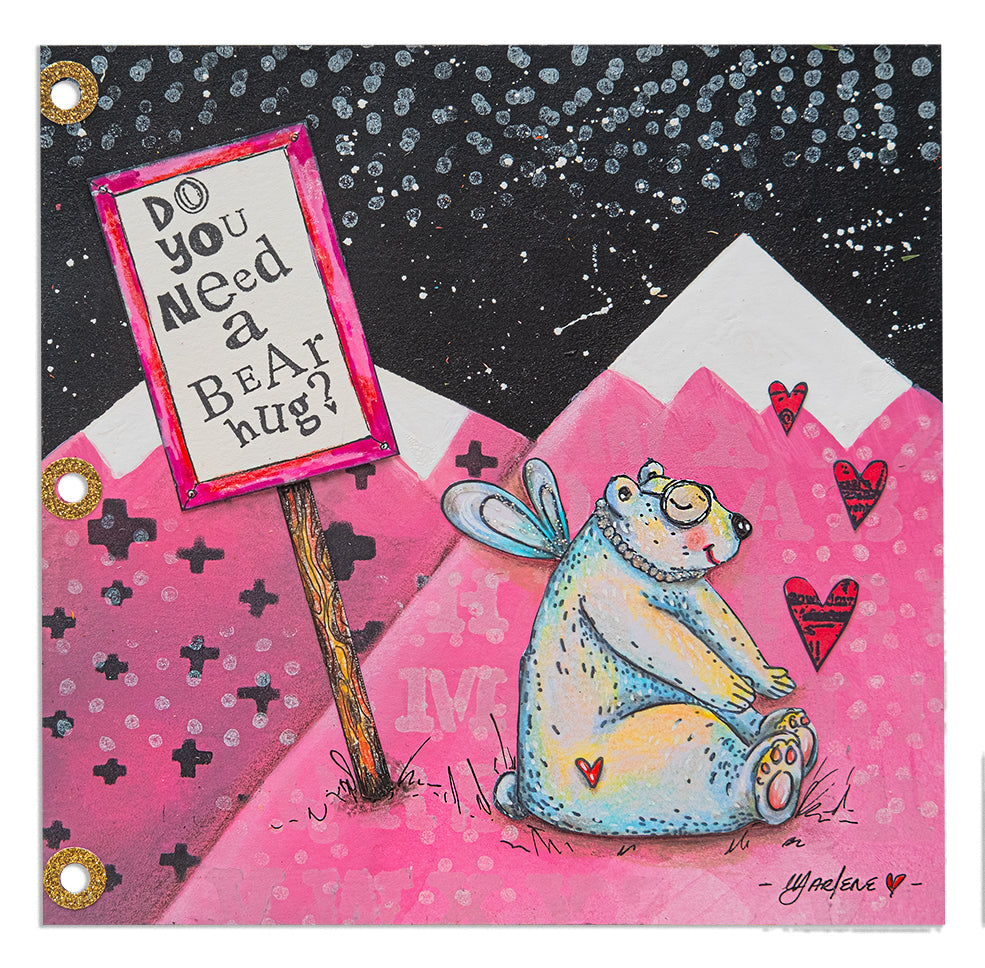 A collection of clear stamps featuring an adorable bear and some sentiments as well as words relating to Bear Hugs. A cute addition to anyone's craft stash. Part of Art By Marlene's Signature Collection.