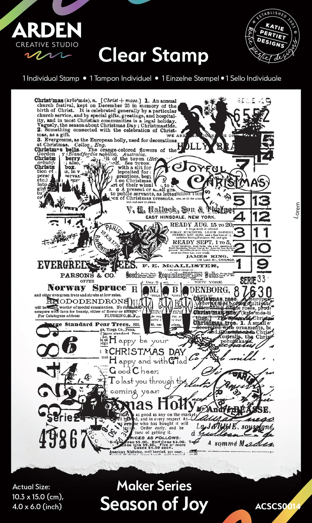 Add a festive touch to your projects with the Season of Joy Background Stamp from the Arden Creative Studio Maker Series. This clear photopolymer stamp features a beautifully detailed background design, blending staple Katie’s style imagery with a mix of different fonts, iconic festive images, and numbers, all tied together with a hint of postmark magic.