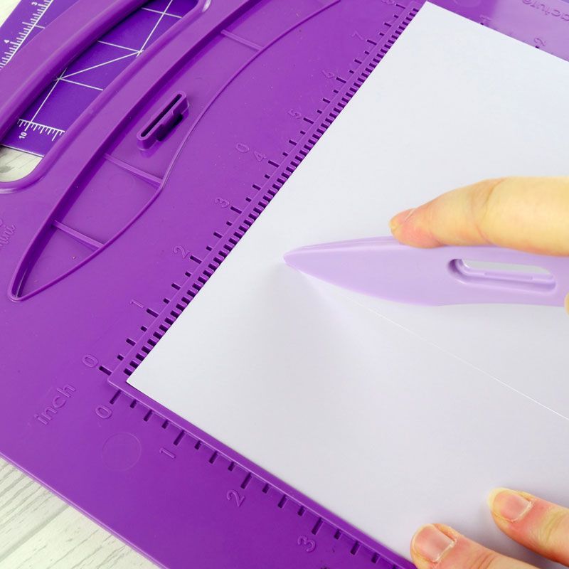 In addition to the great features, the board has an attractive purple design and carry handle for easy transportation. The full size scoring tool is ergonomic, with a wider top edge so that scoring doesn’t create a ridge on your finger. It feels so comfortable in your hand, yet is a substantial tool that will not bend when used. It even clips into your scoreboard, to keep it safe and close by.