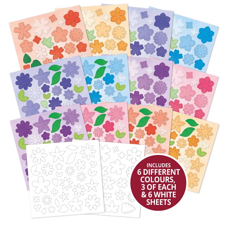 In this pad you will find 2 different page designs featuring an array of flowers in different shapes and sizes, each in 6 different colourways as well as white. The colourways featured within this pad included blush pink, pretty purple, warm coral, sunshine yellow, cornflower and sky blue. Different shaped leaves are also scattered throughout so you can construct realistically styled centerpieces and embellishments for your cards and projects. Also included are 6 sheets of each of the two page designs in classic bright white paper. The bright white pages included extends the versatility of this pad, giving you the option to create elegant white only centerpieces or colour them to suit whatever style you like.