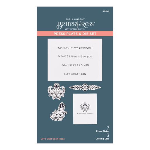 Let’s Chat Soon Icons Press Plate & Die Set is from the BetterPress Collection by Spellbinders. Four of the seven press plates have heartfelt greetings with three accent designs. There are three thin metal cutting dies that will cut the accent motifs into shapes. Ink the plate with the BetterPress Ink to be pressed against the BetterPress Cotton Card Panel and Sheets to create a crisp letterpress design.