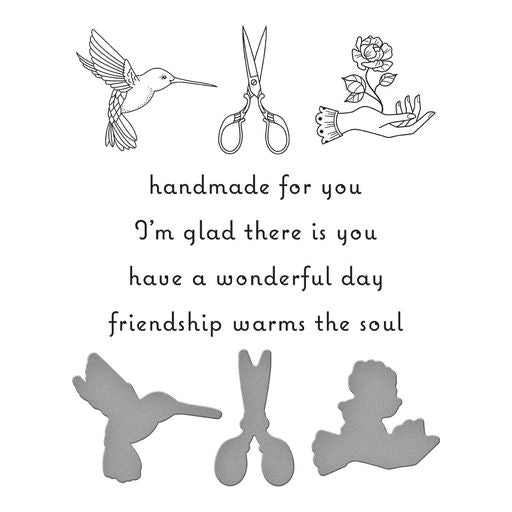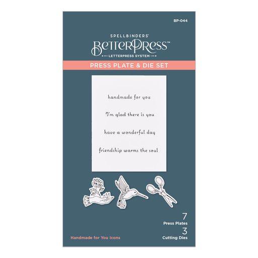 Handmade for You Icons Press Plate & Die Set is part of the BetterPress Collection by Spellbinders. Four of the seven press plates have sentiments of friendship with three themed designs. There are three thin metal cutting dies that will cut the motifs into shapes. Ink the plate with the BetterPress Ink to be pressed against the BetterPress Cotton Card Panel and Sheets to create a crisp letterpress design.