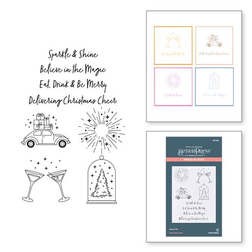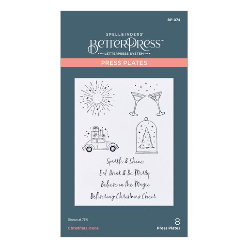 Christmas Icons Press Plates is part of the BetterPress Christmas Collection by Spellbinders. This set of eight press plates had all things of holiday motifs and four holiday-themed phrases. Phrases include Eat, Drink, & Be Merry, Sparkle & Shine, Believe in the Magic, and Delivering Christmas Cheer. The four contemporary style holiday designs are a starburst, gifts on top of the car, a bell jar and cocktail glasses toasting.