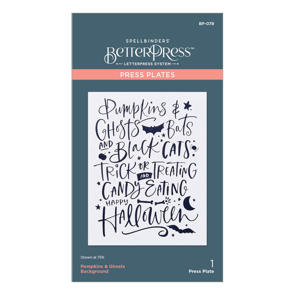 Pumpkins & Ghosts Background Press Plate is part of the BetterPress Halloween Collection. This fun background plate is full of all things Halloween. From the words, phrases to fun images, it would fill a standard A2 size (4.25 x 5.50 in.) card front. What a fun addition to your Halloween cardmaking collection! Ink the plates with the BetterPress Ink to be pressed against the BetterPress Cotton Card Panel and Sheets for a crisp letterpress design.