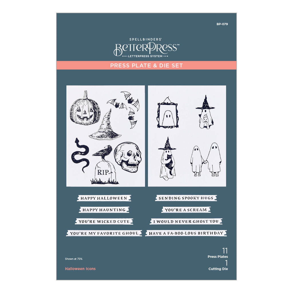 Halloween Icons Press Plate & Die Set is from the BetterPress Halloween Collection with this amazing set of 11 press plates and one thin metal cutting die. It has all the Halloween icons and more from pumpkin, ghouls, bats witch hats and more. It even has a stack of eight Halloween-themed sentiments and a thin metal die that will cut the entire stack in one step. Perfect for those Halloween projects! Ink the plates with the BetterPress Ink to be pressed against the BetterPress Cotton Card Panel and Sheets for a crisp letterpress design.