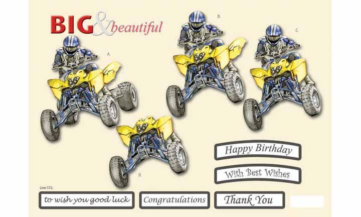 Big & Beautiful -ATV Big and Beautiful Precut prints are single large 3D images. Easy to assemble, simply press out and layer the pieces following the step by step numbering, using 3D glue or foam tabs. Each sheet has 5 Precut captions and a matching backing sheet to use to create that special card. Big and Beautiful 3D prints are perfect for larger cards and scrapbook pages.