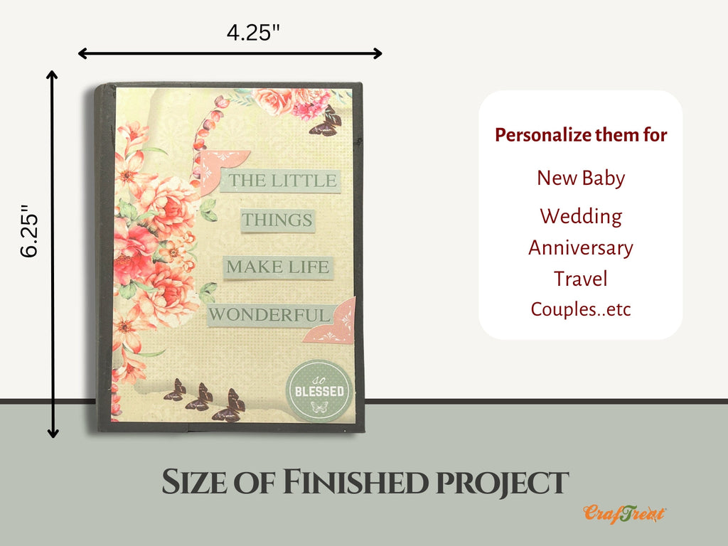 Make quick and easy scrapbooks. Stick the photos you like and personalize them with colorful patterned sheets, embellishments, and stickers. Fill it with memories, photographs, and thoughts.