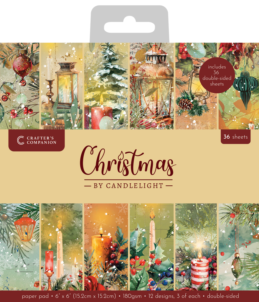 Create colourful invitations, fun cards, and more with the Christmas by Candlelight 6″ x 6″ Paper Pad by Crafter’s Companion. Each pad contains 24 double-sided sheets of paper in 12 designs inspired by classic Christmas images of candles, lanterns, and red and green colours.