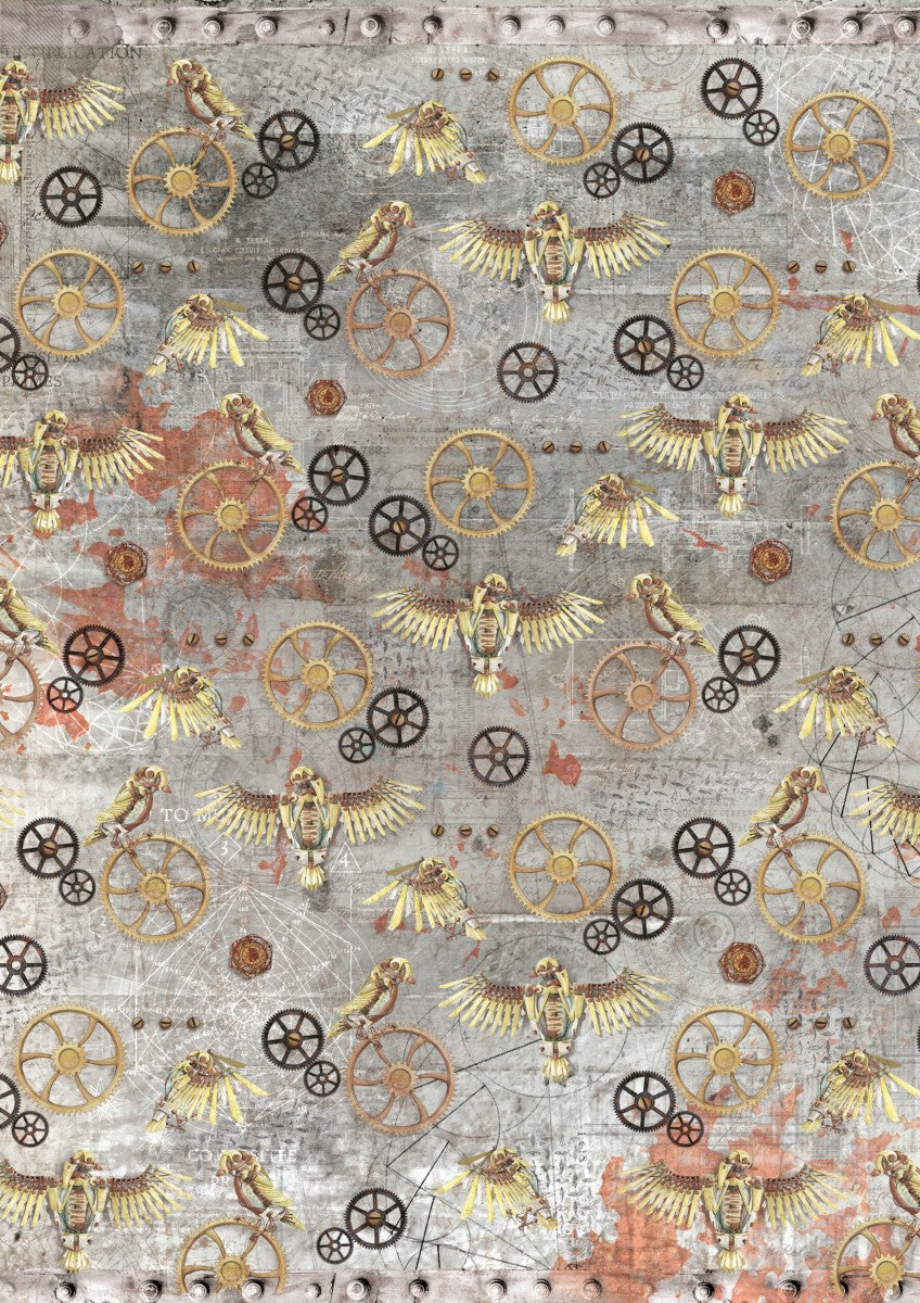 This paper pad has images of mechanical bees and birds, gears, bright bulbs and more.