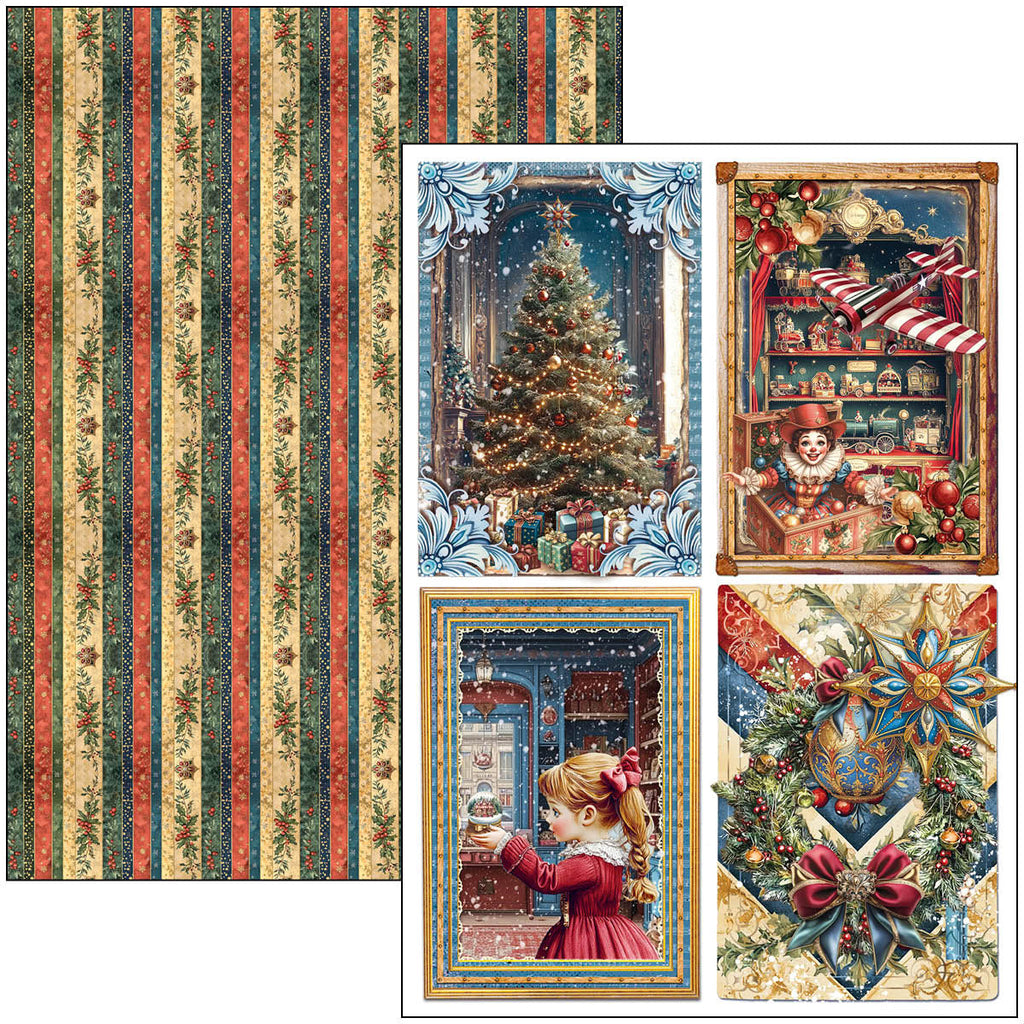 Step into a charming world where time stands still, and the magic of childhood comes alive through the warmth of vintage toys and nostalgic shop windows. “Toy Shop” brings to life the cozy, whimsical atmosphere of an old-fashioned toy store, filled with treasures that echo the joy and innocence of years gone by. The collection’s rich colors – deep bordeaux, serene blue, and soft ivory – create a timeless palette that mirrors the elegance of antique toys and the quaint charm of the shops they come from. Each piece is a tribute to the simple pleasures of childhood, evoking memories of the past while inspiring new ones. Let yourself be transported to a world where every toy tells a story, and every corner of the shop sparkles with festive cheer.