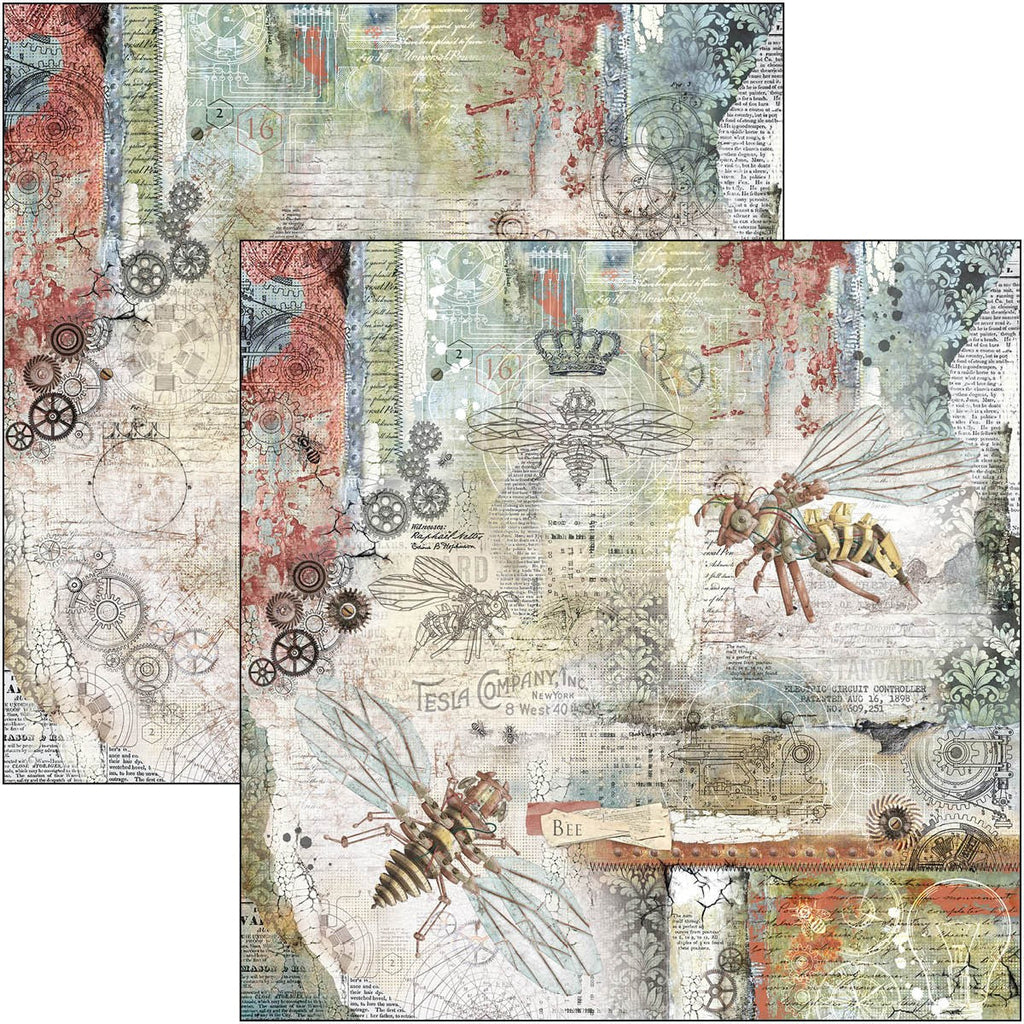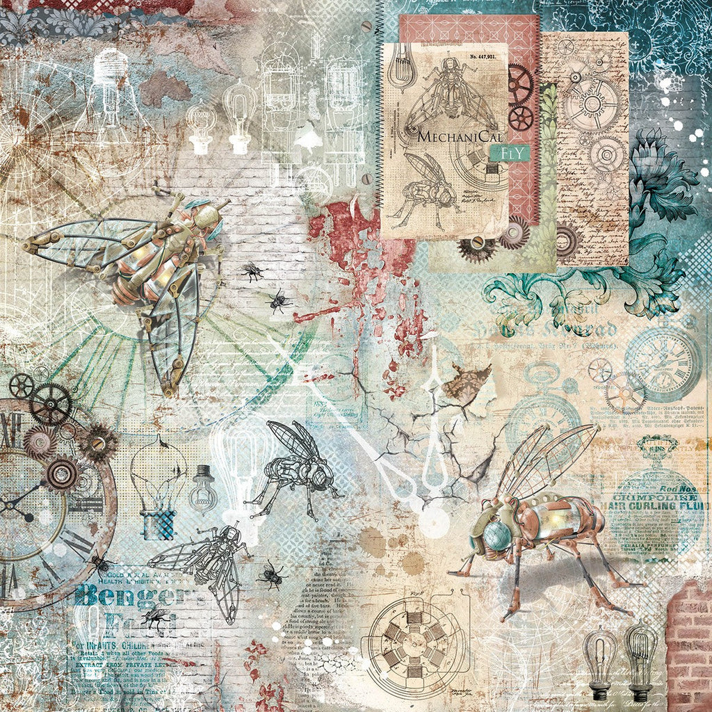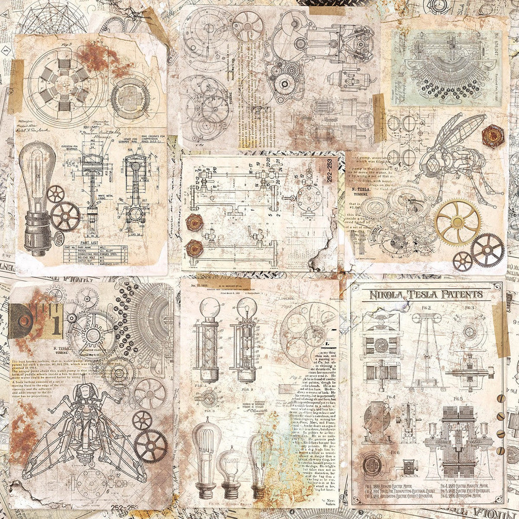 This paper pad has images of mechanical bees and birds, gears, bright bulbs and more.
