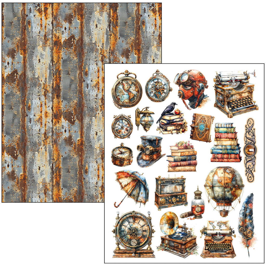 This A4 Mixed Media Book Past Time set includes 50 double-sided pages, including: 39 unique patterned designs and 11 ephemera pages with cards, tags, tickets, fussy-cut elements, and other decorative goodies. Unleash your style with the vintage rustic textures and illustrations that feature a steampunk aesthetic. Perfect for junk journal, collage, scrapbooking, cardmaking, mixed media and paper craft arts.