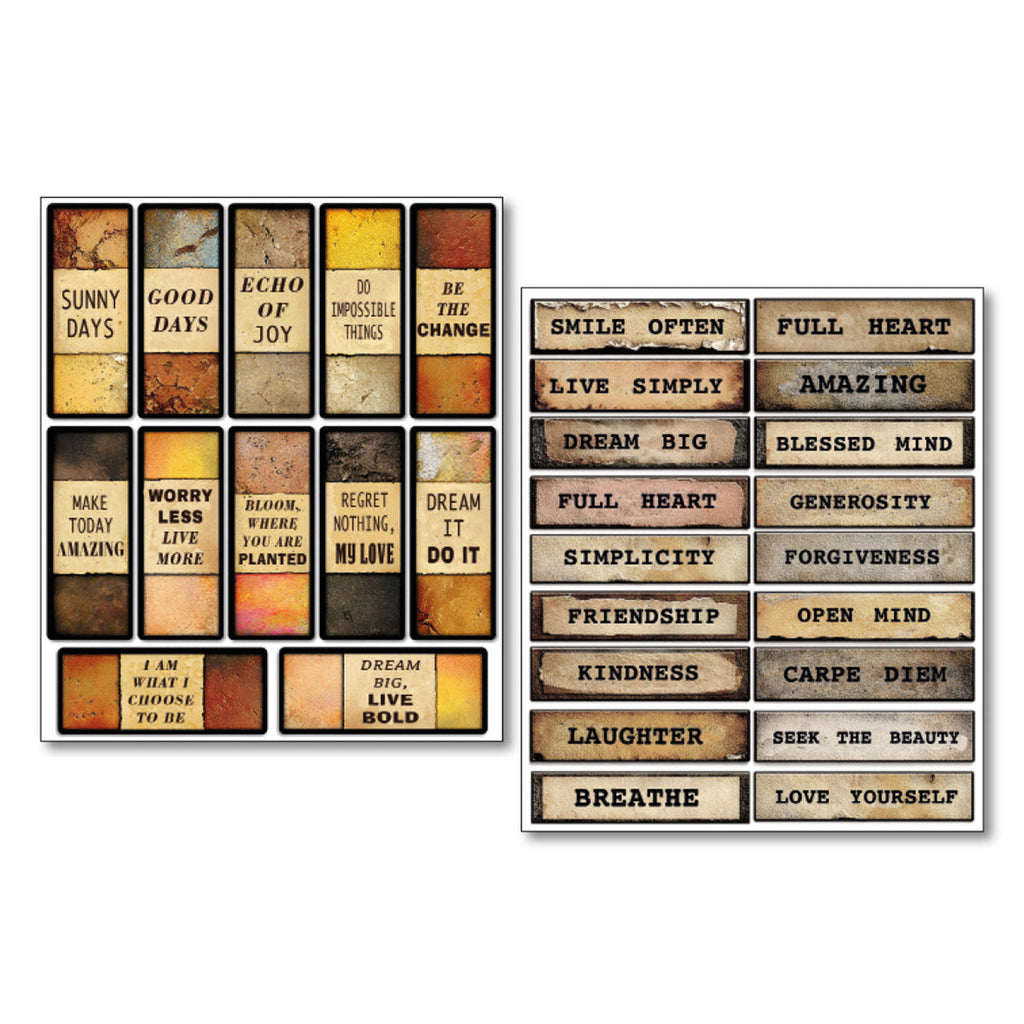 A set of 10 assorted uncut transparent adhesive sheets with a vintage feel featuring tags and labels with heartfelt sentiments. The stickers are perfect for mixed media, collage, junk journal, scrapbooking and paper craft arts.