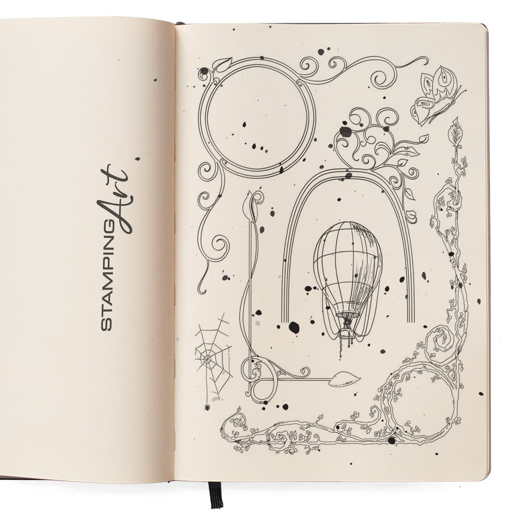 - 7 Stamp Set includes images of a hot air balloon, a butterfly, a spider's web, and corner frame flourishes