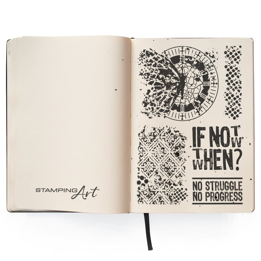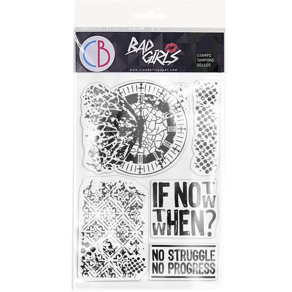 - 5 Stamp Set; mixed media elements includes images of a clock and a butterfly and the sentiments 'If Not Now When' and 'No Struggle, No Progress'