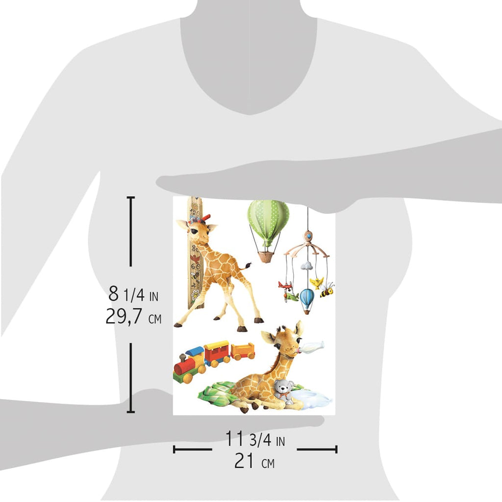 - 1 design; includes images of baby giraffes, a hot air balloon, a toy train and a mobile