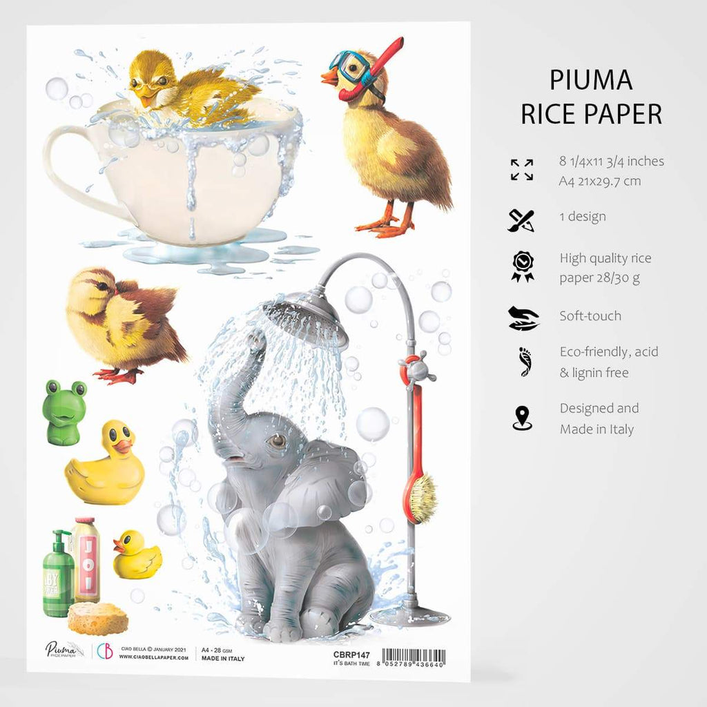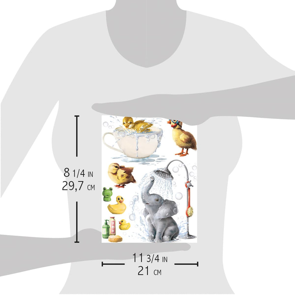 - 1 design; includes images of ducklings, a baby elephant taking a shower and bath time items