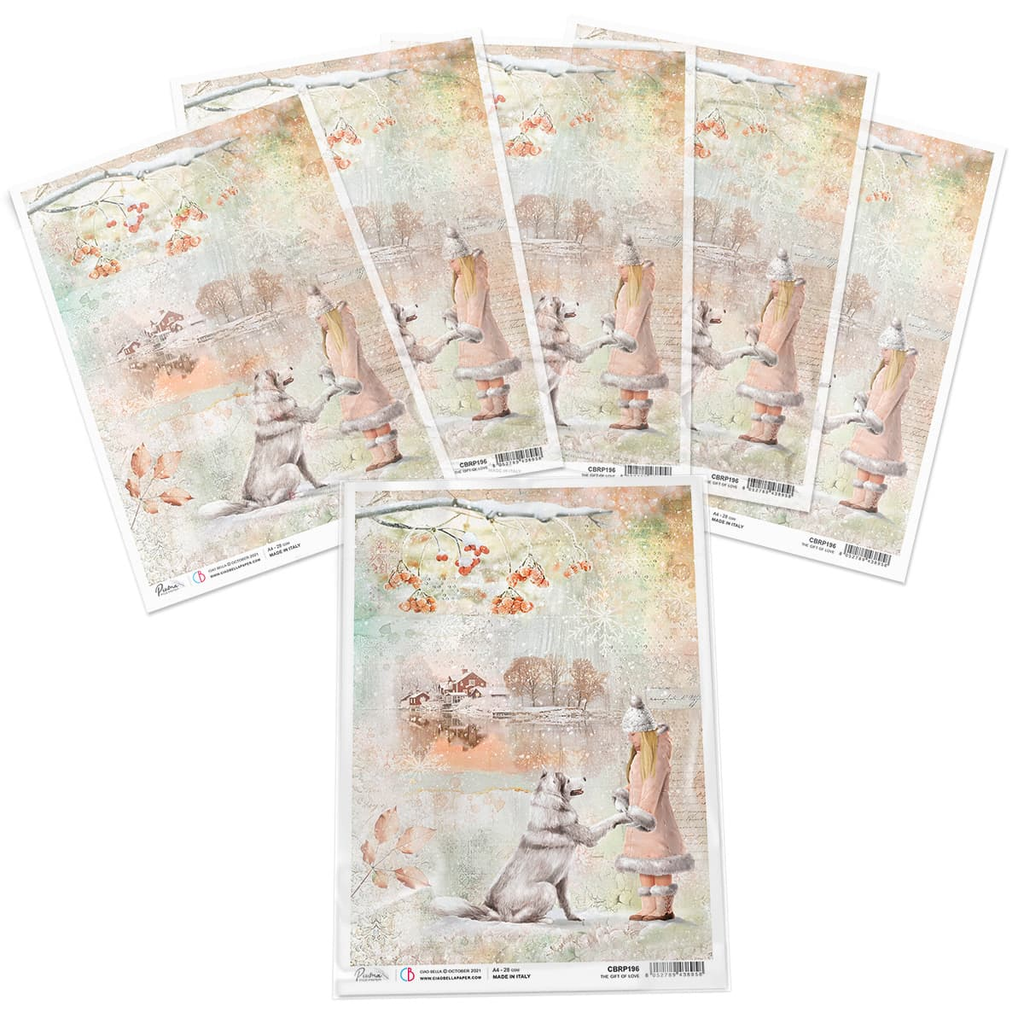 - 1 design; includes an image of a wintery scene with a girl and a dog in a field by a stream, with a house in the background