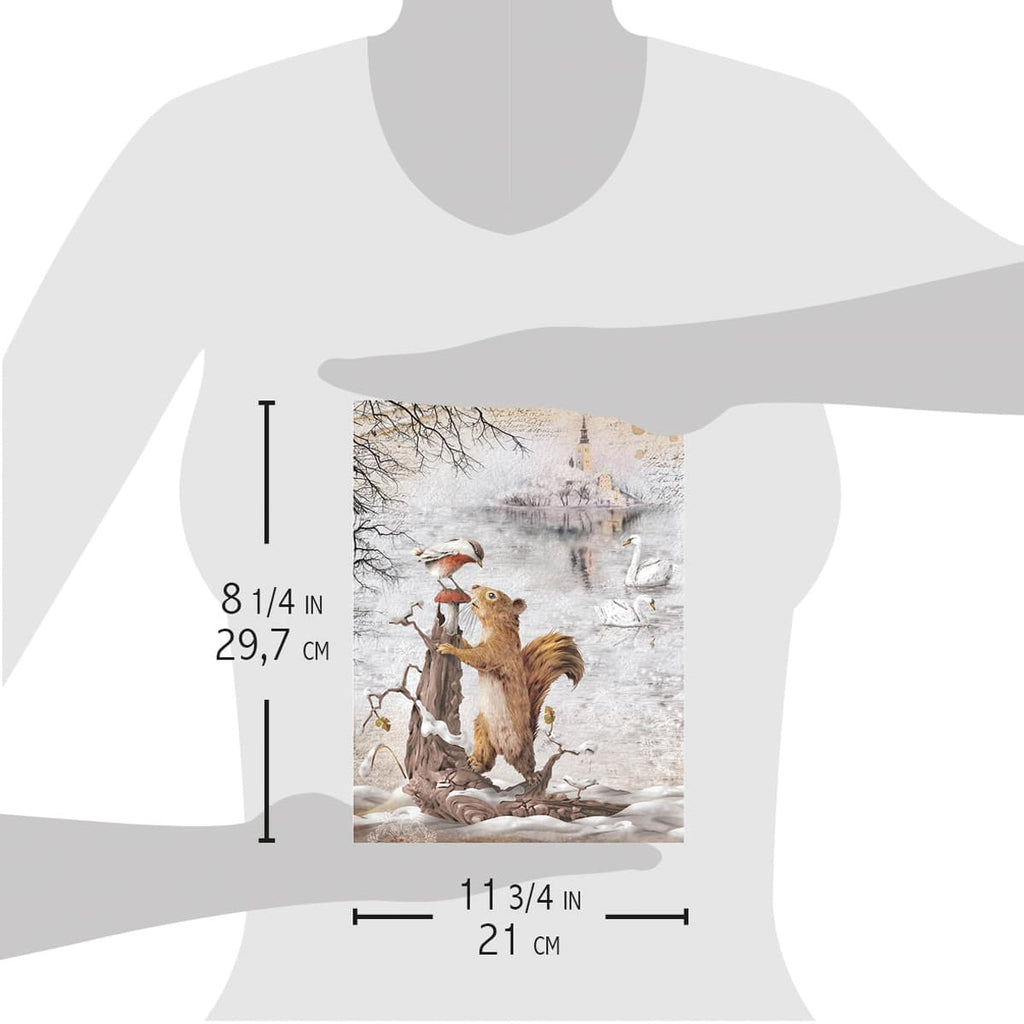 - 1 design; includes image of a wintery scene with a squirrel and a winter bird with swans swimming in the background