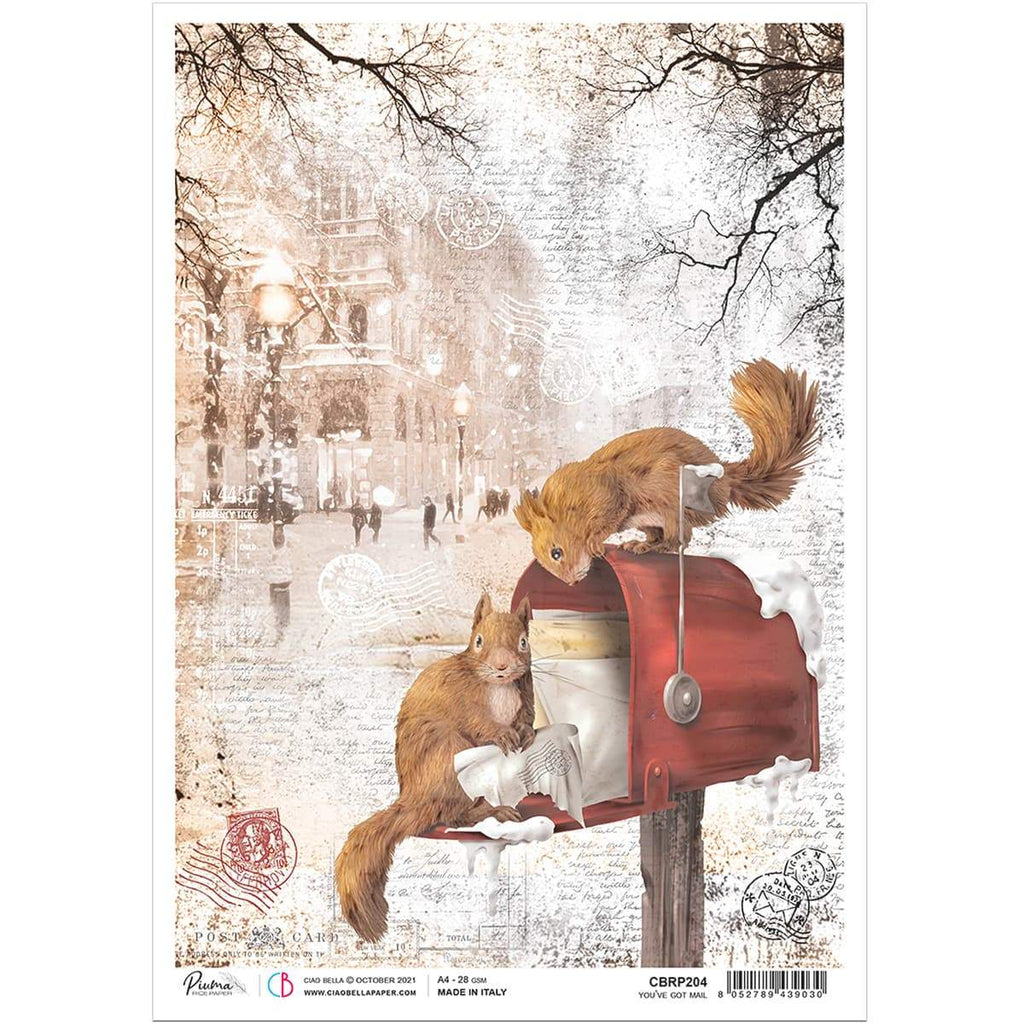 - 1 design; includes image of a wintery city scene with two squirrels in a mailbox