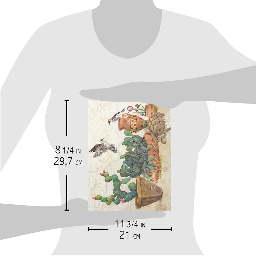 This single sided sheet of rice paper includes an image of a variety of cacti in pots, birds, a tortoise and clay pots.