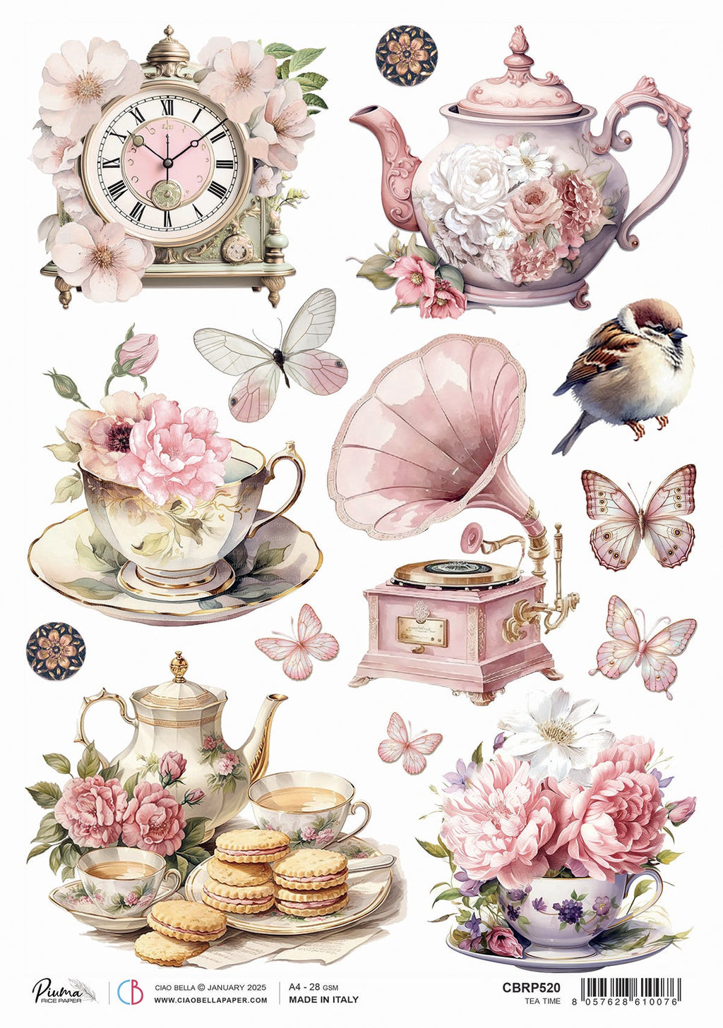 A number of images that remind one of a pleasant tea time in the Spring. Includes tea cups and pots, birds and butterflies, and more. Prefect for fussy cutting and adding that extra something to your crafting project.